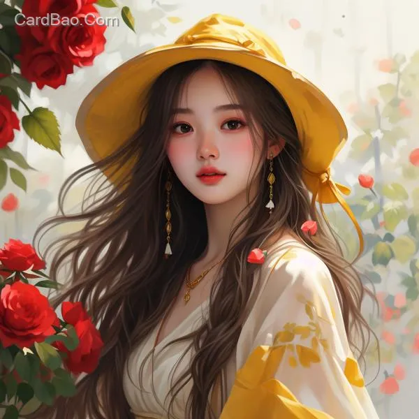 Beautiful girl, long hair, delicate features, wearing a white dress and a yellow hat, holding a bouquet of red roses, with a red rose background, in a light and fresh, healing style, aesthetically pleasing.