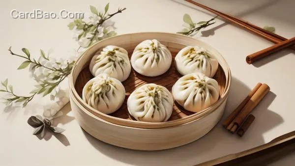 A basket of freshly steamed Shanghai soup dumplings, with thin skin and tender filling, rich in broth, is placed in an exquisite bamboo steamer. Beside it is a dish of fragrant vinegar and a pair of bamboo chopsticks, set against a wooden dining table and a pot of green tea, reflecting the delicate and elegant style of the Jiangnan region. Jiangnan flavor, refined, elegant.