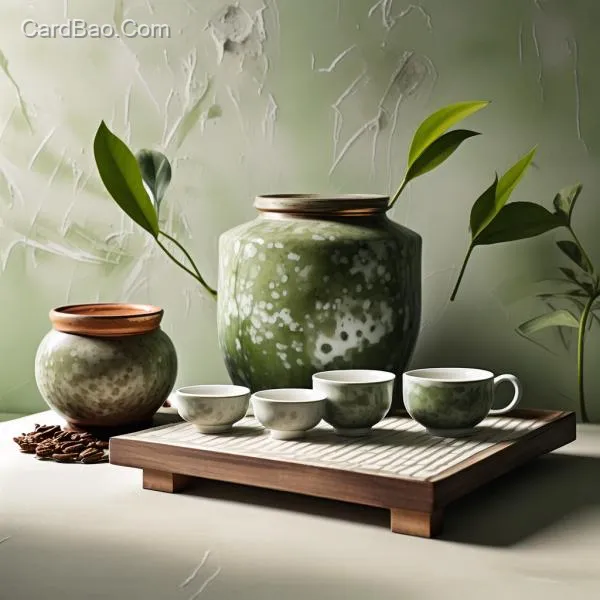 A product display with a loose green theme, featuring a cinematic composition. The background is a light green wall, with a white countertop holding a jar of mold tea. Beside it, there is a teacup filled with golden tea, a wooden tray, and fresh leaves as accents, creating a fresh and elegant tea-tasting atmosphere. The image is a low-angle professional color photograph, intended for commercial use as a main image. It includes edge lighting, volumetric lighting, an ultra-wide-angle lens, high detail, ultra-high quality, a strong sense of lens presence, and high resolution. The style is inspired by Korean comics, concept art, and rendered with a red-shift effect.