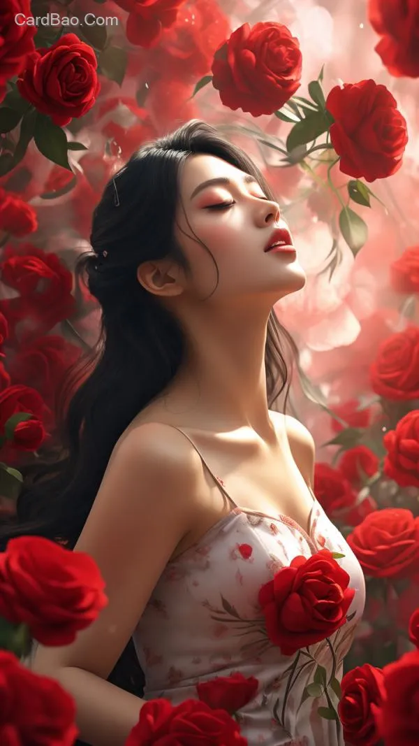 Generate a poster for International Women's Day, featuring a beautiful woman with her eyes closed, head tilted slightly upward, and a beam of light gently illuminating her face. She is surrounded by roses, with full red lips and fair, delicate skin. The background is composed of red roses in a 2.5D illustration style, using bright colors with soft, natural lighting. The overall image should be in 4K resolution.