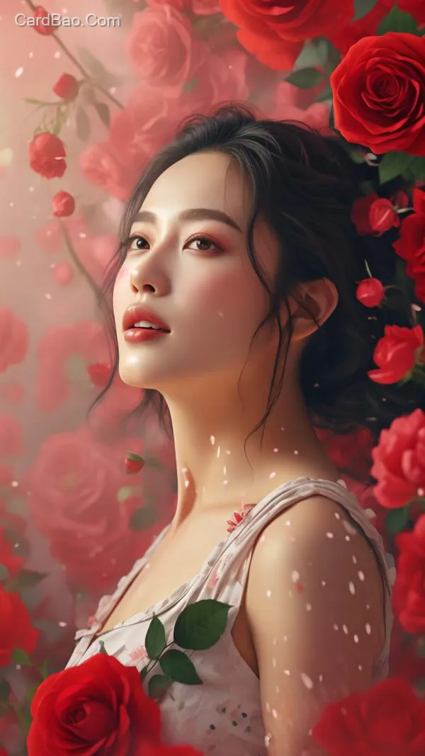 生成一张38妇女节的海报,一位美女双眼紧闭,昂头斜向上,一缕光打在美女的脸上,美女周围被玫瑰花环绕,嘴唇红润,脸庞白皙精致,红色背景有玫瑰花组成,3D插画,明亮的色彩,柔光,自然光,4K,
