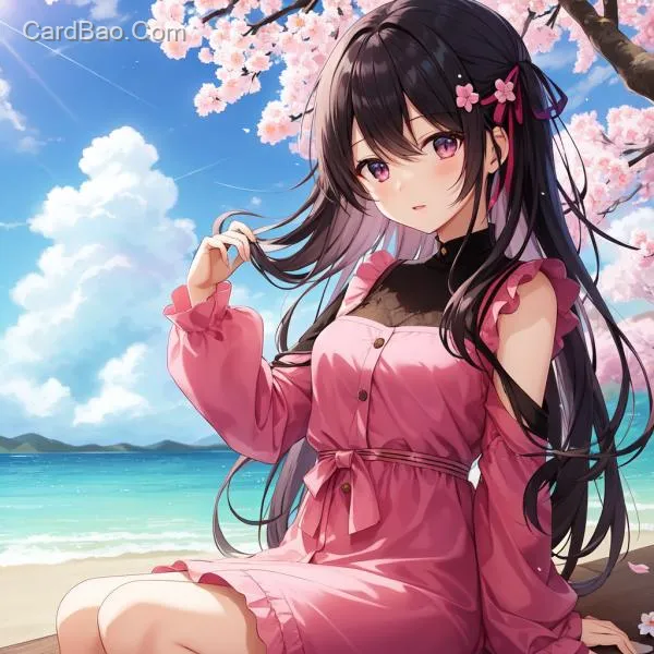 Anime style, a girl is enjoying the scenery under a plum blossom tree, wearing an elegant pink long dress, with long black hair, holding a plum blossom in her hand.