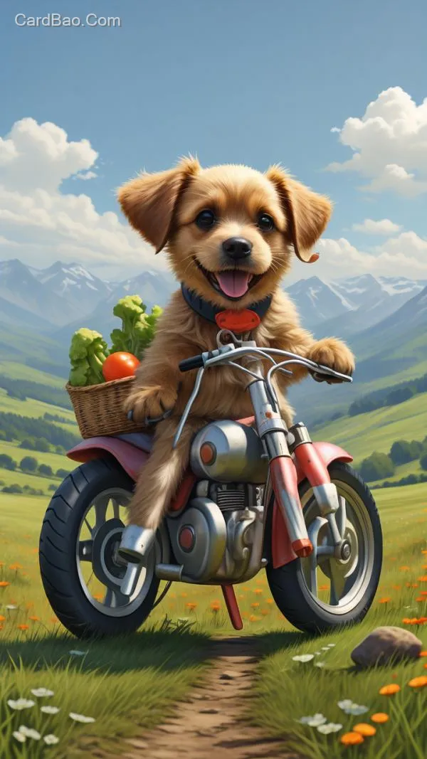 The video showcases a small dog wearing headphones, driving a brightly colored miniature motorcycle across a lush green lawn. The bike's basket is filled with a variety of fresh vegetables, resembling a moving pastoral landscape. Notably, a relaxed and content kitten is perched on the dog's back, with the two demonstrating perfect coordination as they joyfully speed along. The backdrop features rolling mountains and a clear blue sky dotted with fluffy white clouds, creating a refreshing and delightful scene. The dog's focused expression and the kitten's leisurely posture together capture the unique joy of this extraordinary ride.