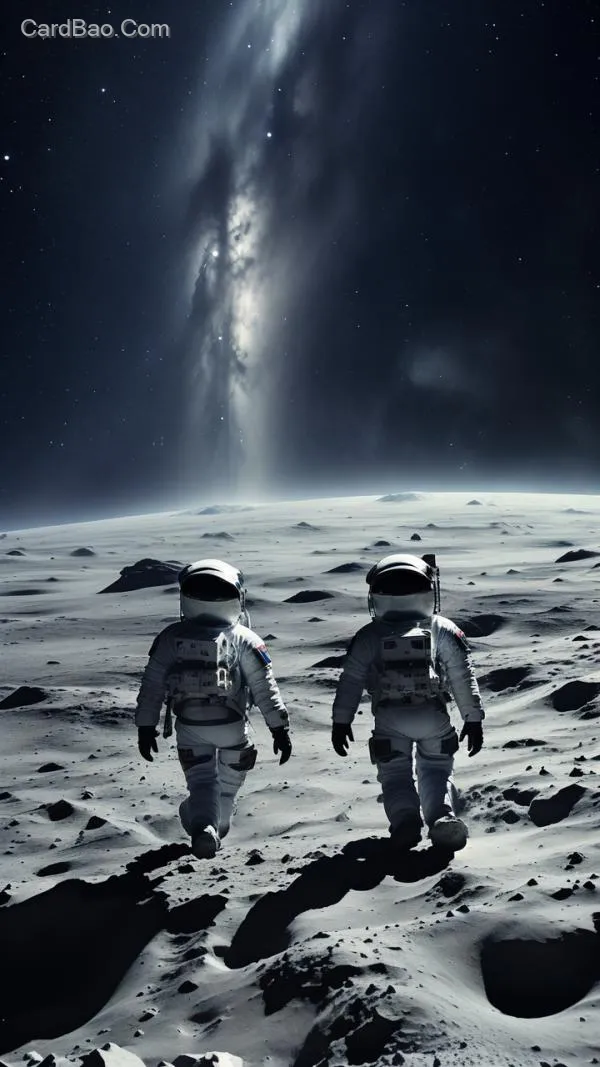 The video shows two astronauts in heavy spacesuits walking slowly on the lunar surface, each step leaving deep footprints in the gray moon dust. Suddenly, a gleaming spacecraft emerges from the distant cosmic background and lands precisely near them. The astronauts turn and walk toward the spacecraft, are taken aboard, and disappear into the dark starry sky. The entire scene is filled with a sense of science fiction and the courage to explore the unknown.