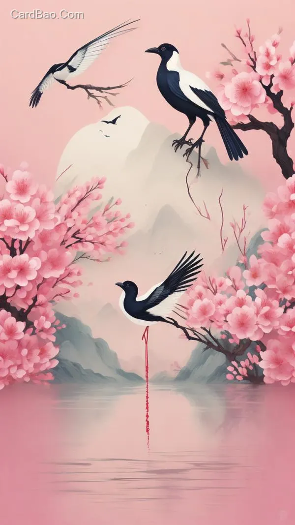 Minimalist Chinese-style landscape vector illustration. A magpie perched on a plum blossom branch, set against a pink background, featuring a flat, paper-quilling-inspired pattern.