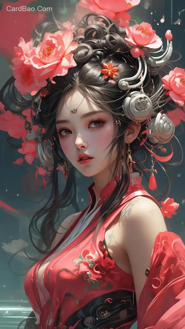 以元素融合艺术的风格描绘了一个赛博朋克美女,古典元素交织在一起,展现了水,火,土和空气在充满活力的桃红色和深海绿色中的和谐融合,最佳质量,三维立体,正确比例,鸟瞰图仰视视角,厚涂风格,辛烷渲染