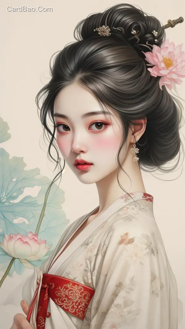 Oriental beauty avatar, elegance that outshines past and present, lotus flowers shy away from her jade-like face, minimalist cartoon style.