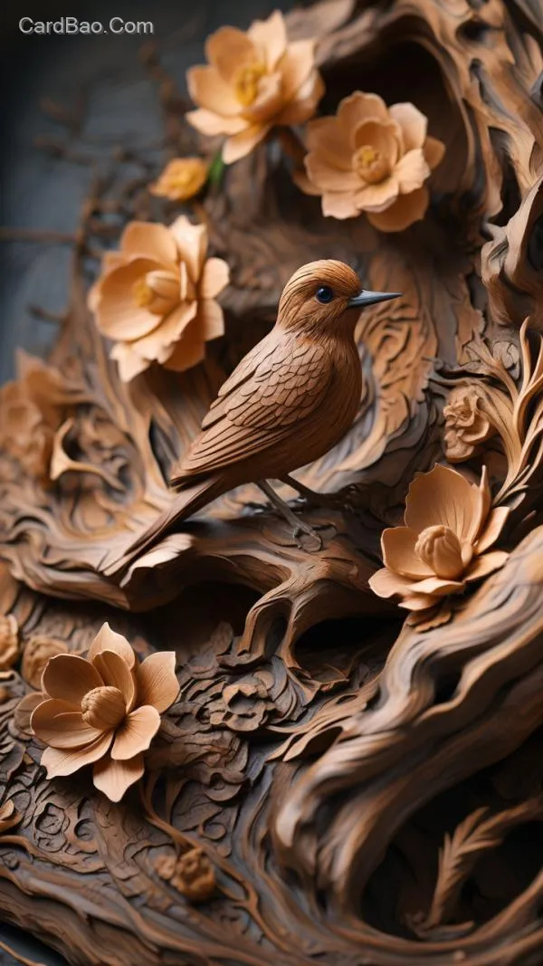 Wooden carved bird and wooden carved flower, texture details, high-definition close-up