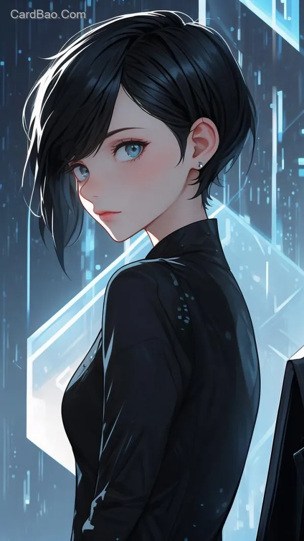 服装:修身哑光黑西装,表面有细微的六边形暗纹,肩部嵌入半透明导光纤维,随呼吸频率波动青蓝色光芒;右手腕佩戴银色生物识别手环。