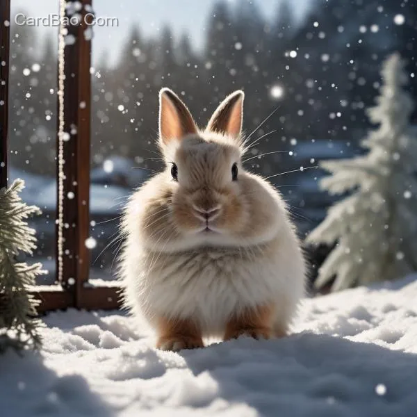 主角:一只胖嘟嘟的兔子站在雪地中,它的身体圆润可爱,毛发蓬松。一些雪花落在它的身上,耳朵和鼻子上也沾着几片雪,显得格外生动。