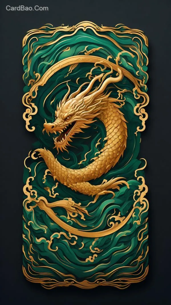 无文字银行卡设计,1988大林木命主题,翡翠绿琥珀金渐变,3D龙纹环绕,八卦边框,88层年轮背景,赛博道教风格,超精细8K渲染