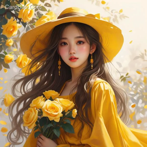 漂亮女孩,长发,五官精致,身穿黄色的裙子,戴黄色帽子,手捧一束黄玫瑰,黄玫瑰背景,小清新,治愈风,唯美