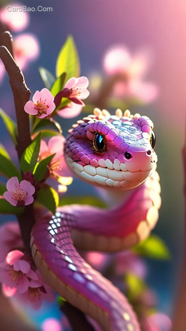 一个粉色小蛇,往外开桃花,爱心彩色,金粉,阳光,丰富多彩的清新浪漫,鲜亮可爱,萌,光影效果,明亮唯美插画,甜美风格,萌萌的,色彩绚丽,亮晶晶,超级梦幻可爱,极致细节,高清晰,8K