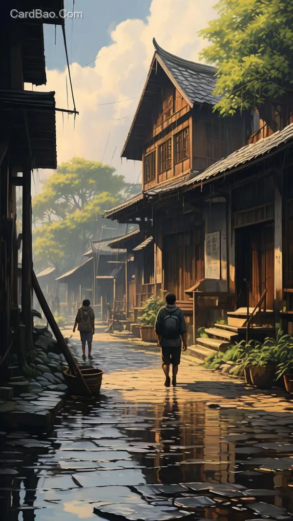 阿明走进寨子,石板路湿漉漉的,两旁房屋的门窗紧闭,偶尔有风吹过,窗户发出嘎吱声响