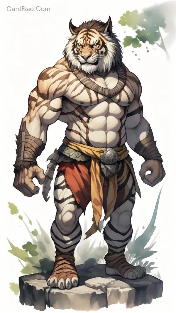 强壮胖的虎兽族人,狮子脸,龙头,六块腹肌,头小,全身赤膊,下半身没穿,动漫化,腿长,水彩画,腿长,身材微胖壮硕,表情犀利,头部比较小,龙,背部照