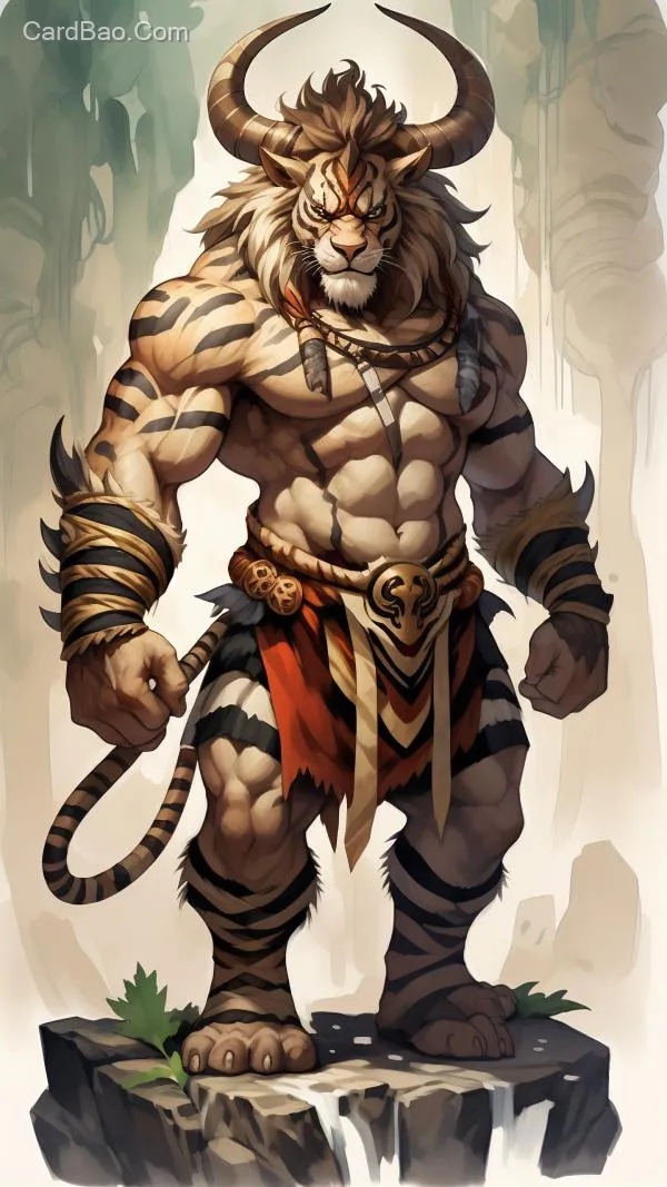 强壮胖的虎兽族人,狮子脸,龙头,六块腹肌,头小,全身赤膊,下半身没穿,动漫化,腿长,水彩画,腿长,身材微胖壮硕,表情犀利,头部比较小,龙,背部照