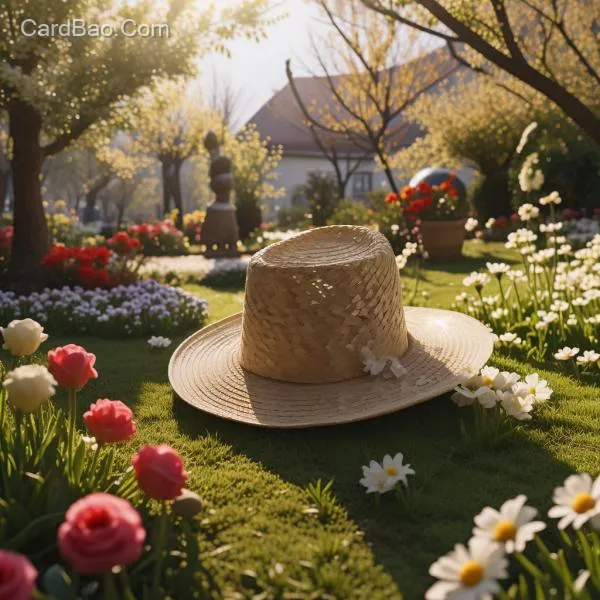 Subject: An elegant white straw hat is placed on the grass, adorned with flowers or ribbons, symbolizing feminine grace and beauty.