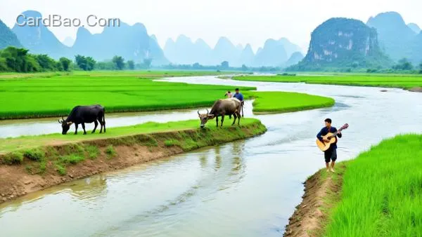 A river flows from west to east, its water clear and pristine. On the northern bank, vast rice paddies stretch out, where farmers are busy transplanting seedlings. Beyond the fields, rolling mountains extend into the distance. On the southern bank lies a large expanse of green grassland, where two water buffalo are grazing with their heads down. Not far from the buffalo, a young man dressed in Yi ethnic clothing is sitting on the grass, playing the guitar.