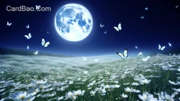 Scenery, a pure white sea of flowers under the moonlight, with countless moonlit butterflies fluttering, and the moon on the horizon.