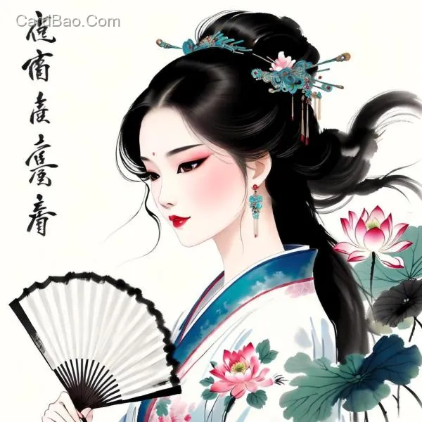 A beautiful woman, dressed in floral attire, with a lovely face, fair skin, and delicate features. Her expression is extremely cold, with flowing hair and billowing sleeves. The image is a close-up portrait of her face, shot against a white background. The style is reminiscent of traditional Chinese ink wash painting, specifically from the Sui and Tang dynasties. She is by the water's edge, holding a folding fan, with lotus flowers beside her and white cranes flying in the sky. The background features ink wash-style poetry.