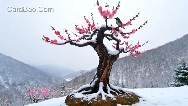天在下着雪,山坡上,一棵粗壮的古梅树主干挺拔向上,显得苍劲有力,表面布满了岁月留下的纹理。梅树的根深扎于黄土地中。从这棵古梅树的主干上,长出了一根细小但生机勃勃的梅花枝。这根梅花枝上开着淡粉色的梅花和花苞,花瓣精致。树干和梅花上有着少量雪花,在这枝梅花枝上,有两只喜鹊,眼睛炯炯有神。远处群山及近处树木撒满雪花。