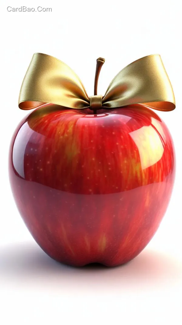 一个好吃的金红苹果系着金色丝绸蝴蝶结,漂亮可爱,饱满温润,透明,极光,色彩缤纷,透视效果,光泽靓丽,层次丰富,新鲜糖果质感,唯美梦幻,雾化效果,明亮红金色调,白色白色背景,超现实主义