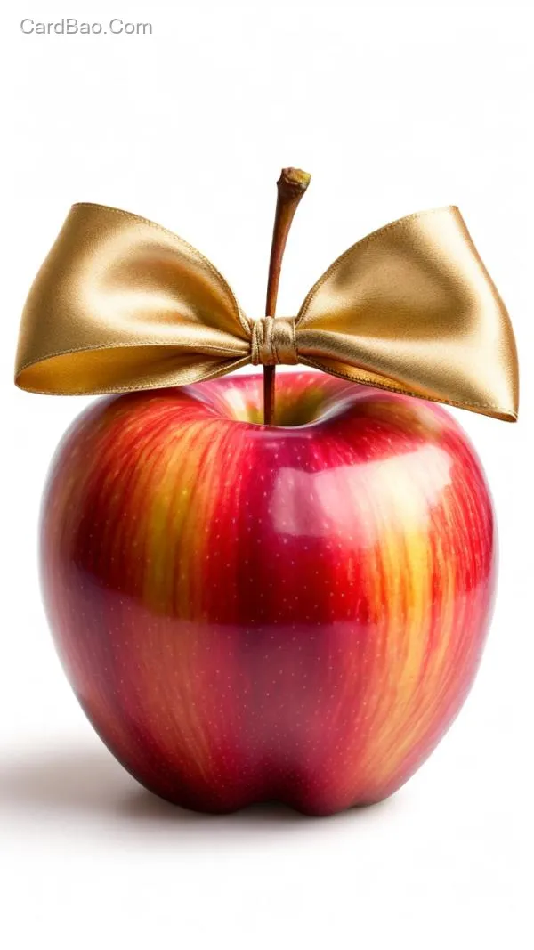 A delicious golden-red apple tied with a golden silk bow, pretty and cute, plump and smooth, transparent, aurora, colorful, perspective effect, glossy and bright, rich layers, fresh fruit texture, dreamy and ethereal, mist effect, bright golden-red tone, white background, surrealism.