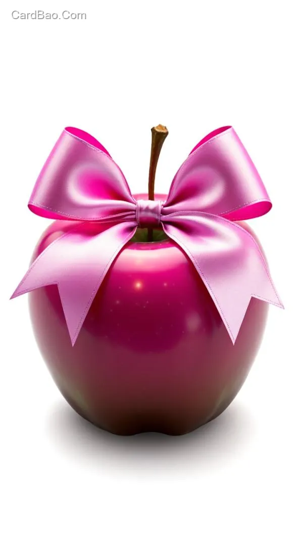A delicious milk chocolate apple tied with a pink silk bow, beautiful and cute, plump and smooth, transparent, aurora, colorful, perspective effect, glossy and bright, rich layers, fresh candy texture, dreamy and ethereal, mist effect, bright milky white tones, white background, surrealism.