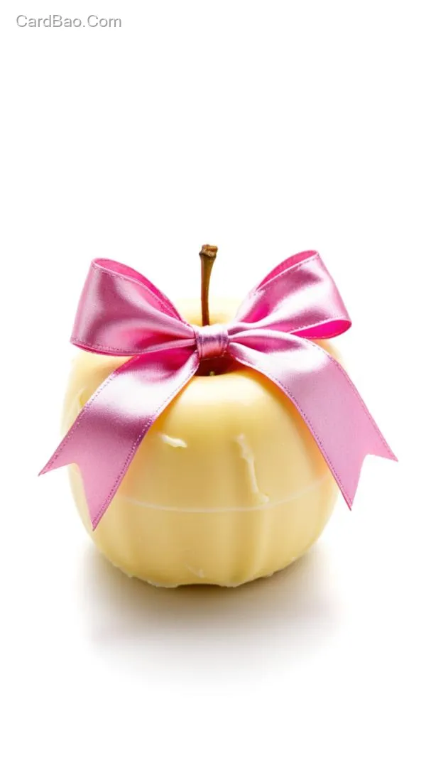 一个好吃的白巧克力苹果系着粉色丝绸蝴蝶结,漂亮可爱,饱满温润,透明,极光,色彩缤纷,透视效果,光泽靓丽,层次丰富,新鲜糖果质感,唯美梦幻,雾化效果,明亮粉白色调,白色白色背景,超现实主义