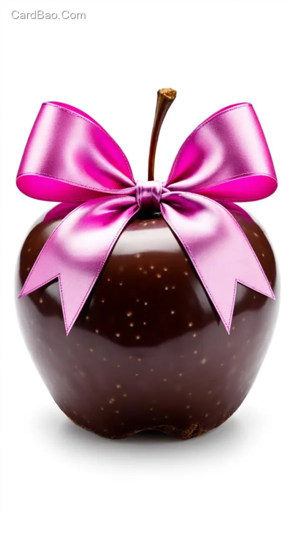 一个好吃的黑巧克力苹果系着粉色丝绸蝴蝶结,漂亮可爱,饱满温润,透明,极光,色彩缤纷,透视效果,光泽靓丽,层次丰富,新鲜糖果质感,唯美梦幻,雾化效果,明亮棕黑粉色调,白色白色背景,超现实主义