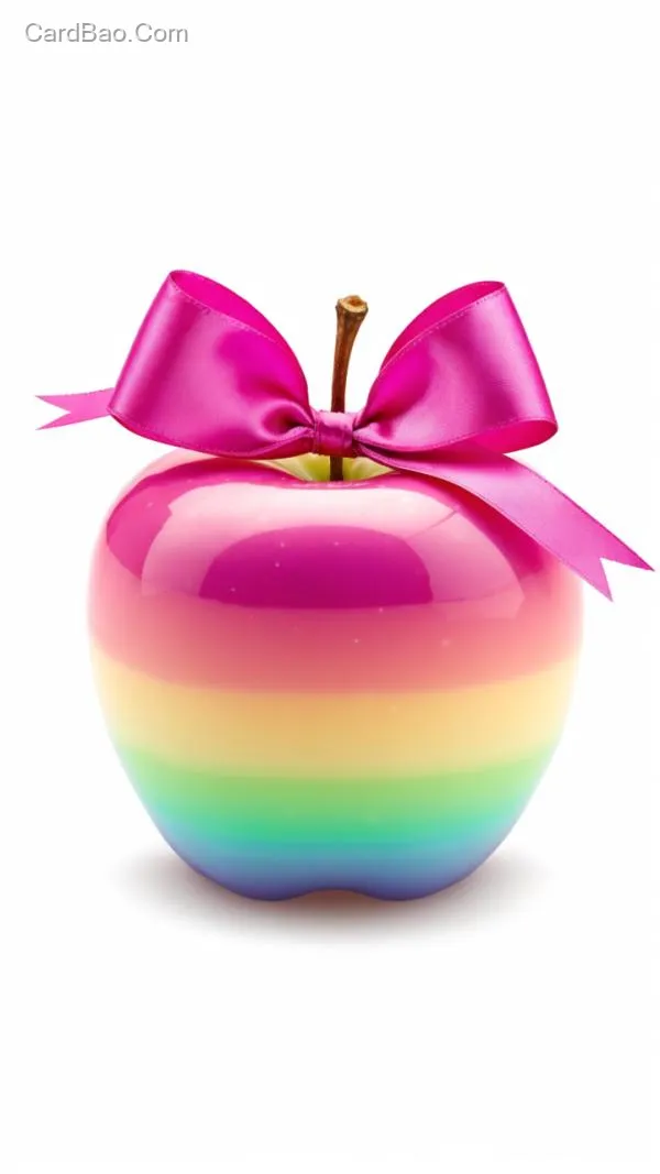 A delicious white chocolate apple tied with a pink silk bow, beautiful and cute, plump and smooth, transparent, aurora-like, colorful, with a perspective effect, glossy and bright, richly layered, fresh candy texture, dreamy and ethereal, mist effect, bright brown-white-pink color palette, white background, surrealism.