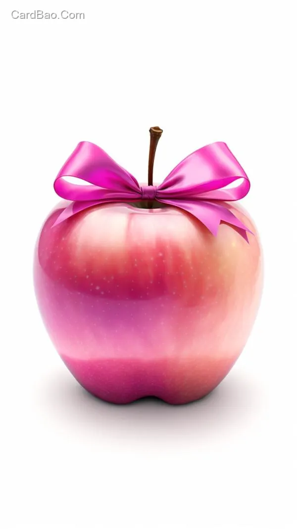 A delicious creamy white apple tied with a pink silk bow, beautiful and cute, plump and smooth, transparent, aurora-like, colorful, with a perspective effect, glossy and brilliant, rich in layers, fresh fruit texture, dreamy and ethereal, mist effect, bright creamy white-pink tones, pure white background, surrealistic.