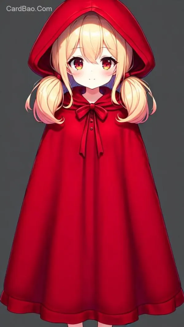 Little Red Riding Hood has arrived in Fushun, wearing an oversized red cloak, with golden hair styled in twin tails, full-body view, in a cute and moe style.