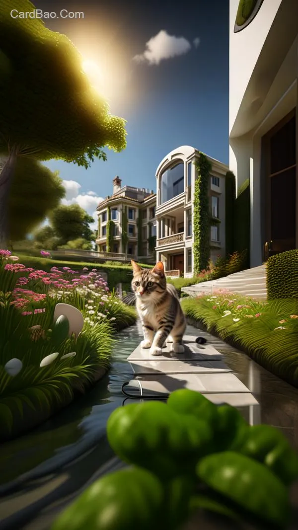猫 奔跑 看手机 绿地 小河 豪华的别墅