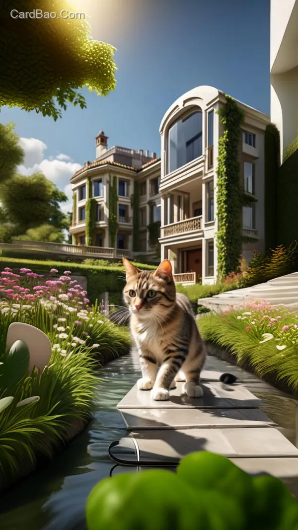 猫 奔跑 看手机 绿地 小河 豪华的别墅