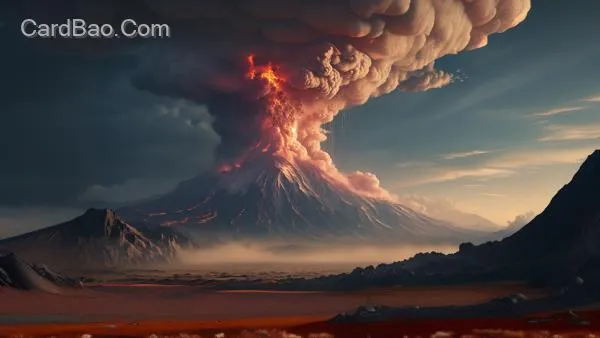 远方,有一座高大雄伟的成层火山,正在爆发。山体呈现灰褐色,外形很像富士山。火山口冒出黑烟直通天际,形成蘑菇云。周边是无穷尽的沙漠。4K超清画面,电影质感,丰富的细节。天空呈现淡黄色,末世感。近景是沙漠沙丘。