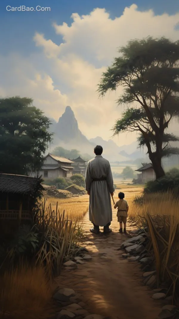画面的中心是福贵和他的孙子苦根。福贵穿着简朴的灰色长袍,面容沧桑,饱经风霜的脸上刻满了岁月的痕迹。他的眼神虽略带疲惫,却透着一种坚毅和宁静。他一手牵着苦根,另一只手拿着一根木棍,作为拐杖。