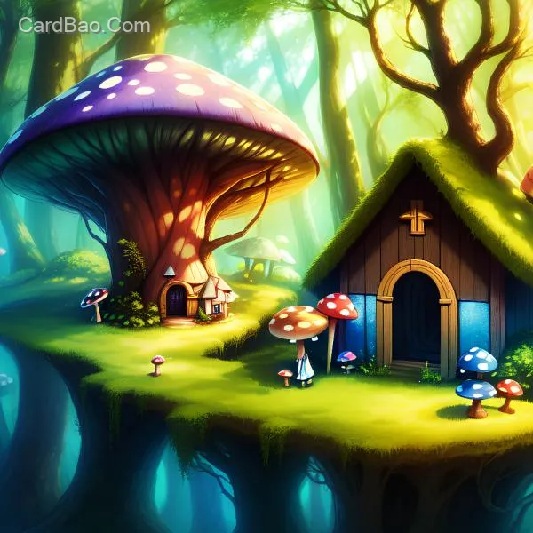 三个男孩,笑嘻嘻,蘑菇屋,奇幻梦境,魔法神秘森林,郁郁葱葱,神秘氛围