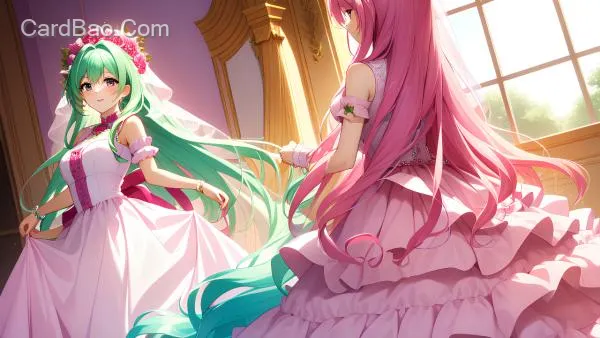 生日蛋糕,金碧辉煌房间粉紫色长发金色抹胸婚纱有绿色