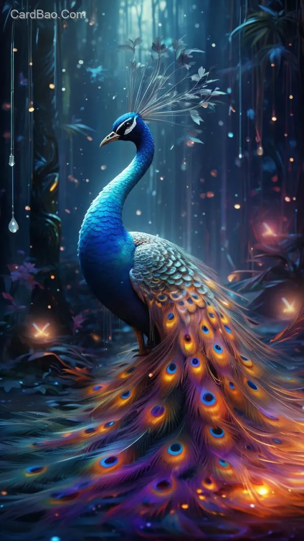 Creative design, dazzling peacock, made of transparent plastic material, emitting a faint glow all over its body, dreamy colors, dark background, aurora, a sprinkle of starlight, high definition, 8K, 3D rendering, dreamy and beautiful ambiance.