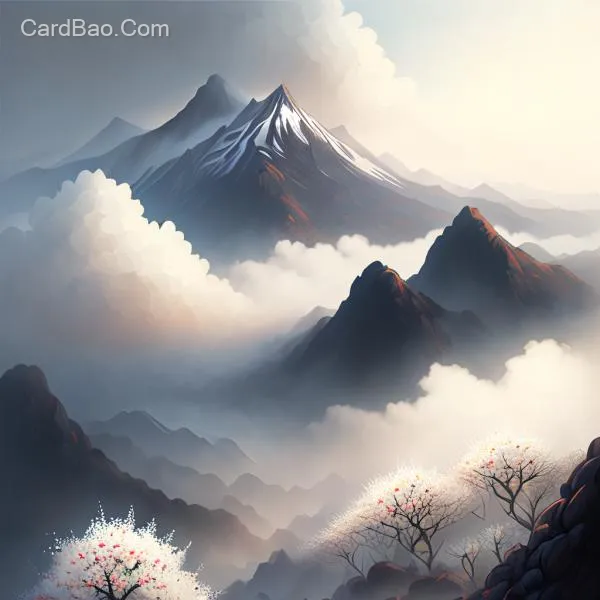 The mountain is covered with pear blossoms, towering thousands of feet high, with mist swirling around and the faint glow of dawn light.