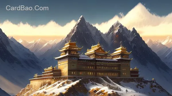Meili Snow Mountain, bathed in the golden rays of the sun. A cascade of golden light descends from the heavens, illuminating the mountain peak, resembling a magnificent golden palace.