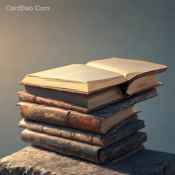 方形石台上方,漂浮着古朴书籍,光影交错,远景