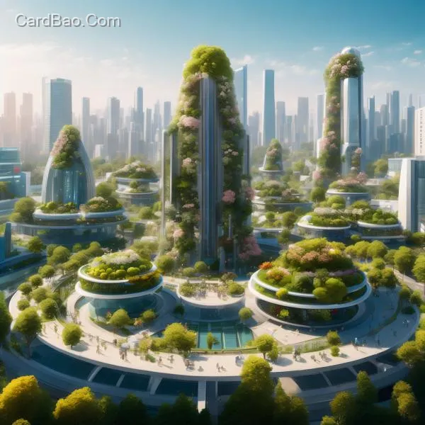 Viewing a super luxurious and technologically advanced skyscraper city adorned with flowers, plants, and trees from the air, while enjoying sightseeing, shopping, and sipping tea.