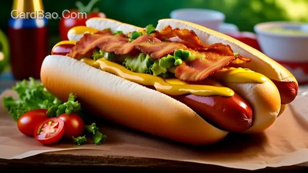 A 30-centimeter-long hot dog filled with bacon, cheese, sausage, lettuce, tomatoes, and pickles, topped with a drizzle of egg yolk mustard sauce—a truly appetizing product.