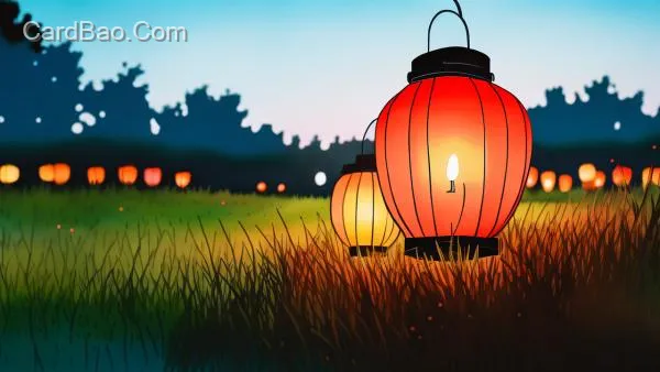 Nighttime, a red paper lantern on the grass, fireworks in the sky, low-angle shot, macro lens, 3D effect, high-definition photo, commercial photography, cinematic lighting.