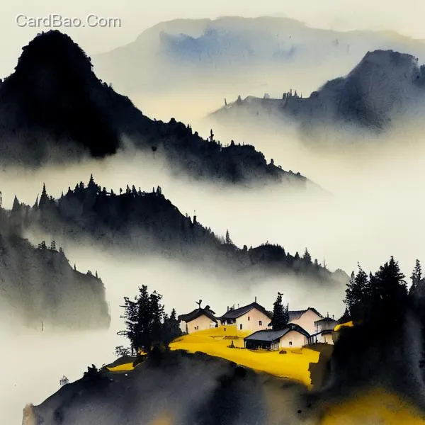 一幅山水画,水彩画风格,黑黄配色,孤村飞鸟,云雾晕染,技术性高细节,自然光,丁达尔效应,渐变的光线强度,俯视视角,壮阔,超精细细节,极致高清,8K分辨率