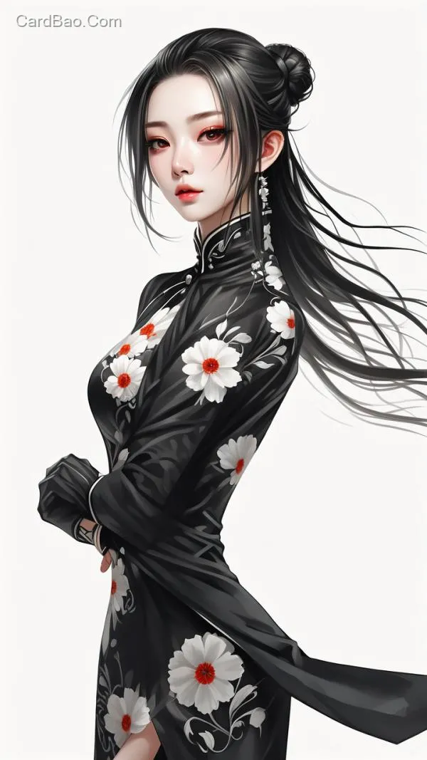 Black eyes, qipao, delicate facial features, refined, long hair, beautiful, full body, standing front view, fair skin