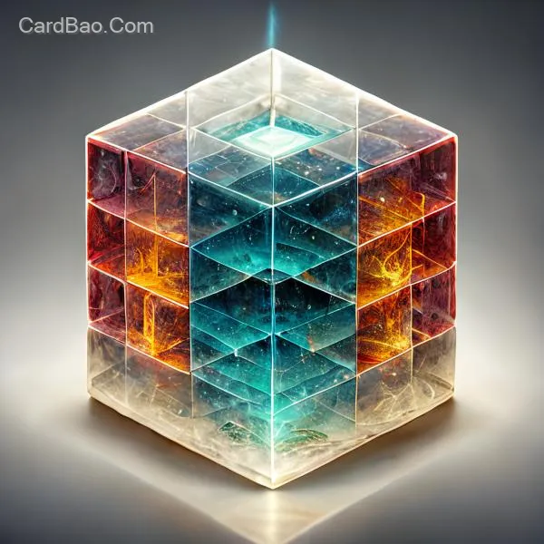 A second-order Rubik's Cube with a crystal texture, featuring eight compartments, each containing a mythical beast with intricate details, in a panoramic composition.