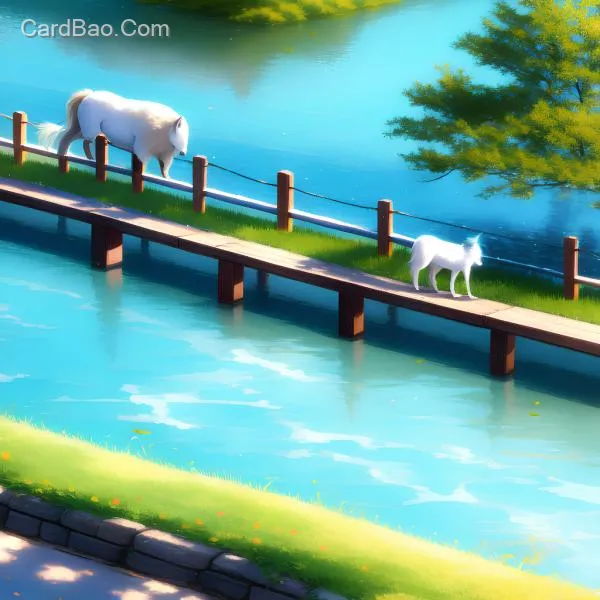 A little pony is crossing the river, with a water buffalo and a squirrel nearby.